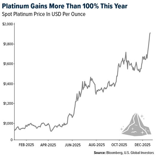 - The worst performing precious metal for the week was gold, still up 0.97%. Swiss gold exports fell 15% to 109.5 tons in November, led by a 92% month-on-month slump in shipments to India, according to the Swiss Federal Customs Administration. India, historically sensitive to higher gold prices, may be waiting for a pullback before buying.