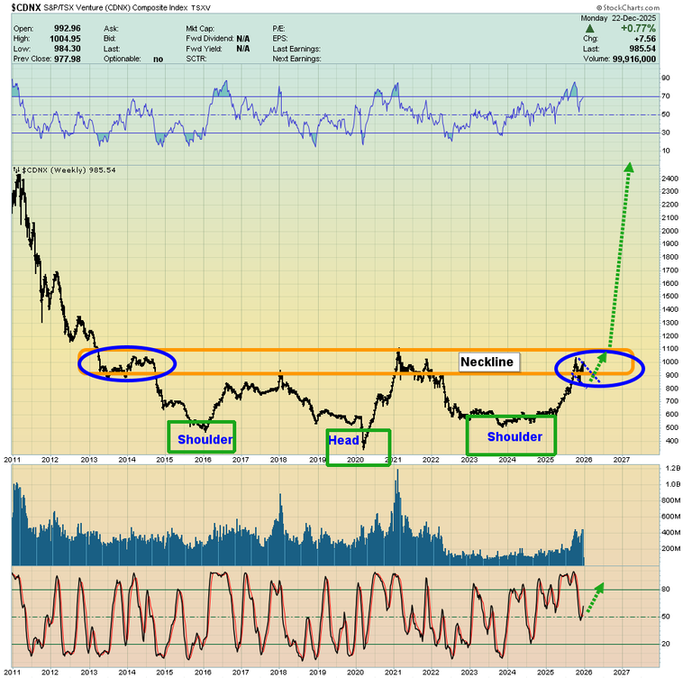 19. Incredibly, numerous junior explorers are already “100 baggers” from their lows… before the CDNX has even moved over the neckline of its massive inverse H&S pattern.