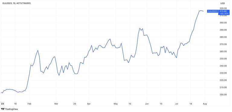 So, the orange juice futures market is not calm either. The next chart reveals a general scenario where prices have surged by over 50% since the beginning of 2023.