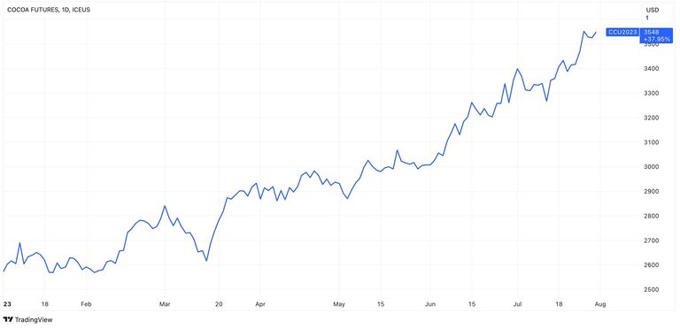 The reason for this last months’ hike is opposed to the prevailing heatwave. Heavy rainfalls in West Africa are contributing to the exceptionally speedy spread of black pod disease, which causes pods to rot and blacken. In other words, we may experience a cocoa deficit in 2023-2024, further driving up chocolate prices. Extreme heat may also cause additional damage after rains, but it has not done so yet.