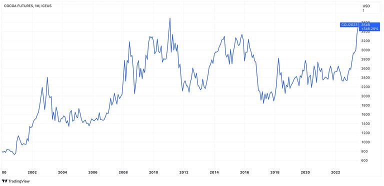 Cocoa might not be an asset you frequently check. So, it may be hard to estimate whether such growth is excessive or not. That’s why we’ve prepared one more chart, indicating that cocoa prices have reached these levels only for the second time in this century.