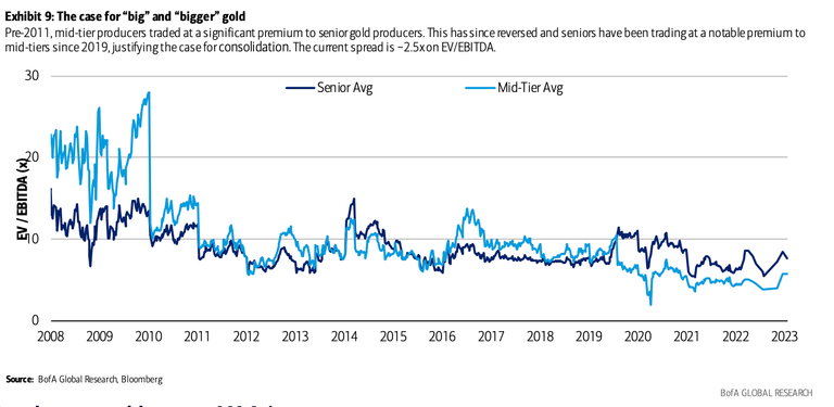 The chart below, constructed with data from Bank of America and Bloomberg, plots the Enterprise Value divided by EBITDA valuation for senior and mid-tier gold producers.