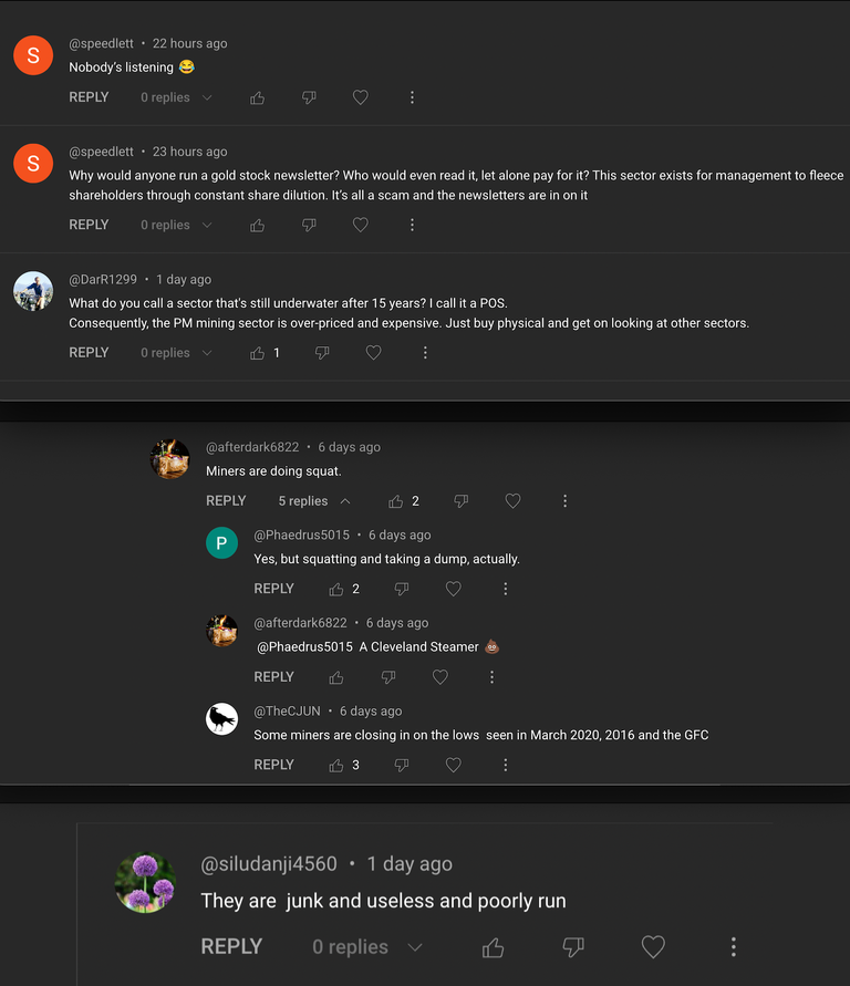 After a nearly three-and-a-half-year-long bear market, one can imagine how investors and speculators feel about the sector. Here is a sample of the comments in response to my video.