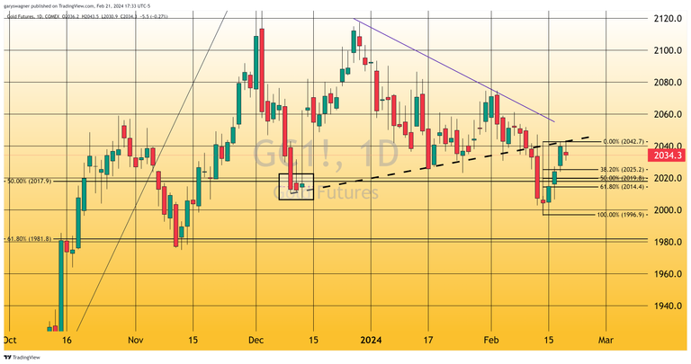 Gold futures had three consecutive days of higher highs, lows, and higher closes until today. As of 5:25 PM ET, gold futures basis most active April contract is fixed at $2034.30 after factoring in today’s decline of $5.50. Today’s price decline was fractionally aided by a slightly lower dollar which declined by 0.07% taking the dollar index to 104.009.