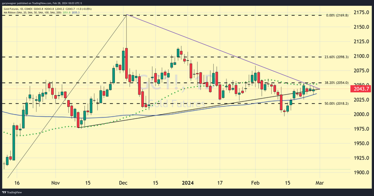 As of 5:20 PM ET gold futures basis the most active April contract is fractionally lower currently fixed at $2042.70 after factoring in today’s decline of $1.40.