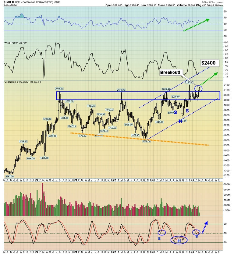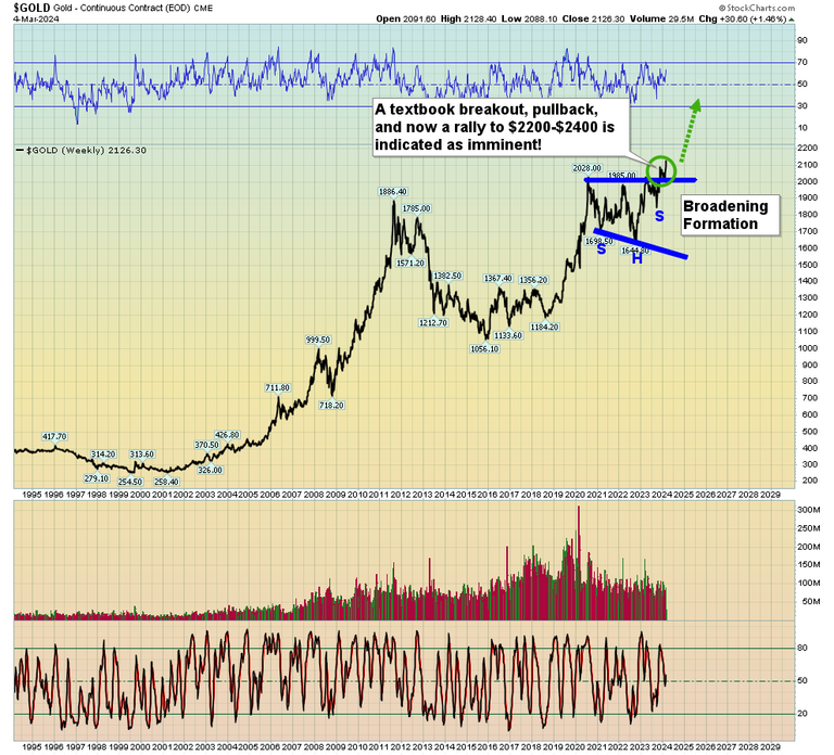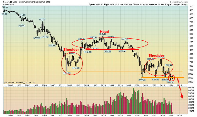 4. An impressive broadening pattern breakout and inverse head and shouldering action is in play. The target is a minimum of $2200, with an “overshoot” to $2500 being possible too.