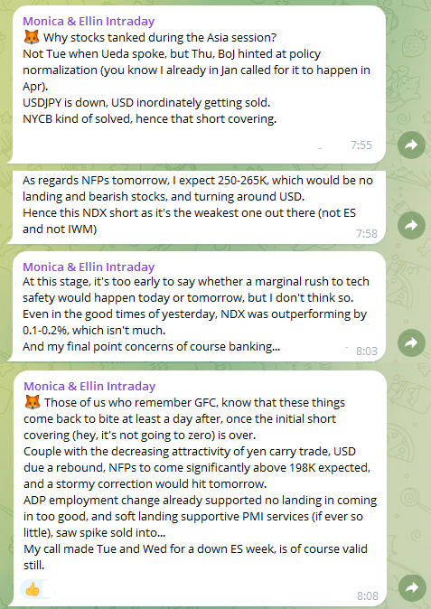 Powell didn‘t commit to any time specified rate cut, and S&P 500 disregarded JOLTS coming in no landing way. It was only NYCB (when it was almost simultaneously announced it raised fresh capital) and then BoJ hinting at policy normalization that have sent equities lower late in session and then some more.