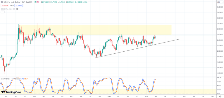 I suggested a target of $30 for silver back on March 6 as well; although that target is still a possibility, the probability of it being hit (on this run) has shrunk. With strong overhead resistance at $26 looming and momentum for this move increasingly likely to exhaust as price peaks, it may be a good time to reset timing expectations for a larger move in silver, to later this year.