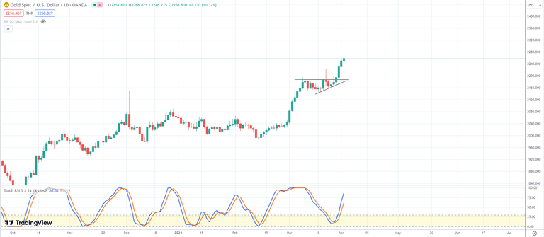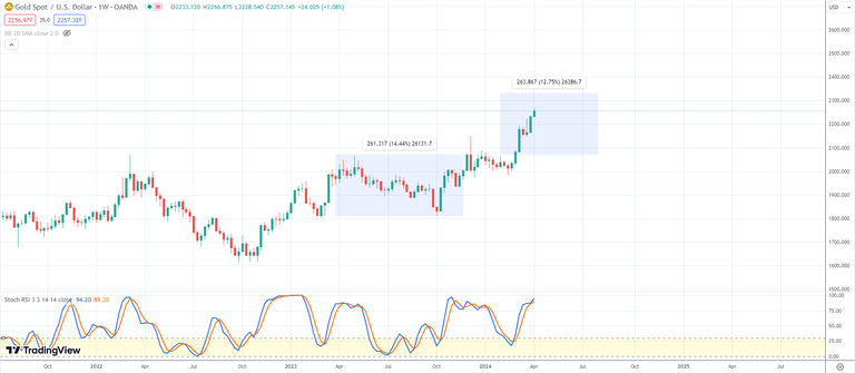 (Kitco Commentary) - On March 6, I suggested a target for gold of about $2,335; I showed the below weekly chart, now updated with price action since then.