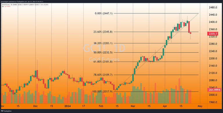 Gold futures regained some stability on Tuesday, trading down just 0.23% after a sharp $60 decline in the previous session. The April 2024 contract touched an intraday low of $2,304.60 before recovering to $2,335.57 as of 5 PM EDT.