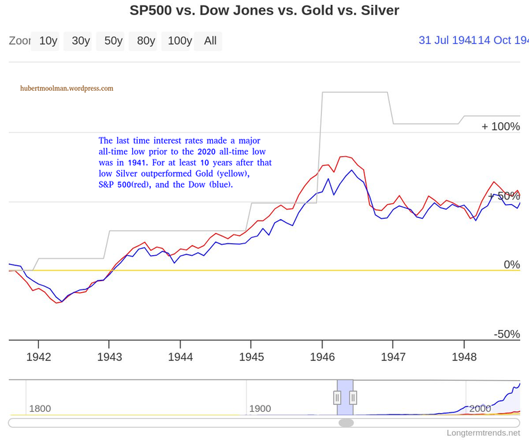 Below is a chart showing the performance of gold, silver, the S&P500, and the Dow Jones after the last major interest rate bottom (1941).