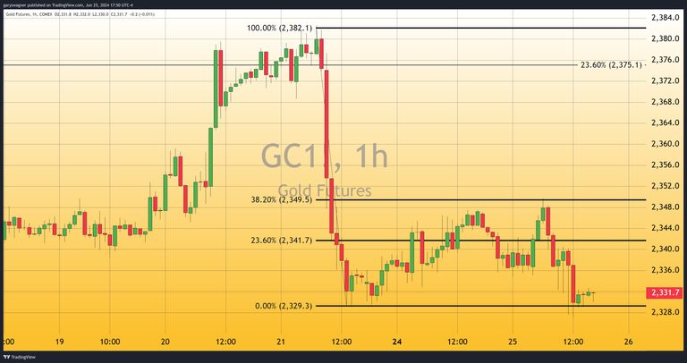 A less restrictive monetary policy could provide bullish tailwinds for gold, as the precious metal typically performs better in low-interest-rate environments. However, current dollar strength, higher yields, and selling pressure have exerted downward pressure on gold prices. As of 5:30 PM ET, gold futures for August delivery were trading at $2,331.70, down $15.50 or 0.66%.