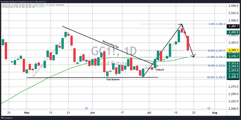 The rally resulted in gold futures gaining over $185 in just 17 trading days, prompting an expected price correction. By the weekly settlement, gold had retraced 50% of its recent gains, falling within acceptable levels for a bull market correction. Analysts suggest that a correction between 50% and 78% would still be considered normal before signaling a potential pivot or key reversal.