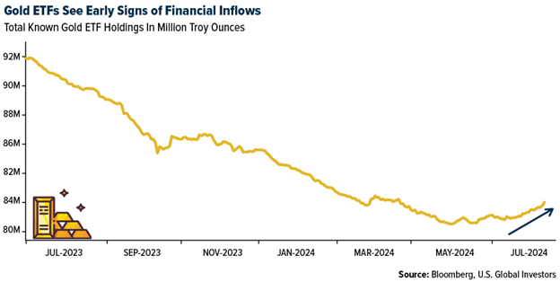 - The best performing precious metal for the week was gold, but still down 0.80%. Total known ETF holdings of gold bottomed out at 80 million troy ounces on May 13, 2024. Since then, investors have had a change in outlook regarding the precious metal, with ETF holdings of gold rising to 82 million troy ounces, a 2% increase. A 2% lift might seem trivial, but holdings have dropped 27% from their high set back in September 2020.