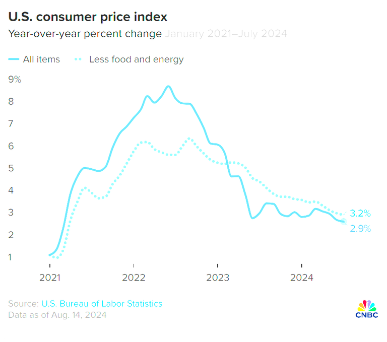 The Labor Department's CPI report for July revealed that inflation has continued to decline, reaching its lowest level since 2021. The core CPI, which excludes volatile food and energy prices, rose 0.2% month-over-month and 3.2% annually, aligning with economists' projections and representing the lowest core inflation rate since April 2021. The headline CPI increased by 0.2% month-over-month, bringing the 12-month inflation rate to 2.9%, the lowest since March 2021.