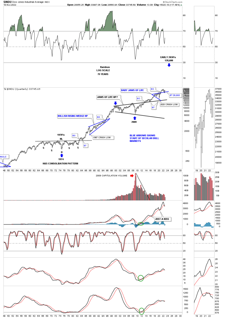 Looking at this quarterly history chart you can see the secular bull market that ran from the mid 1980’s to the 2008 high which ended the bull market with a double top. After a secular bull market like that it will take years to consolidate those gains. Note the internal structure of the 2008 expanding triangle which is partly made up of the blue bullish expanding falling wedge which is strongly suggesting the top rail of the expanding triangle is going to give way. You can also see the small double bottoms and a small double top at the reversal points inside of the expanding triangle.