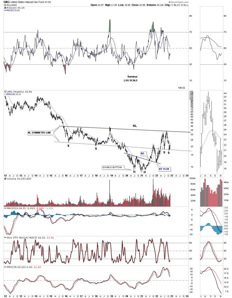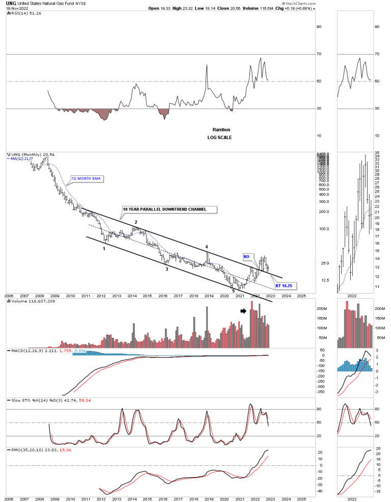 This last chart for tonight is the history chart for UNG which shows a 5 point parallel ten year downtrend channel with a breakout above the top rail and the backtest that is currently playing out.