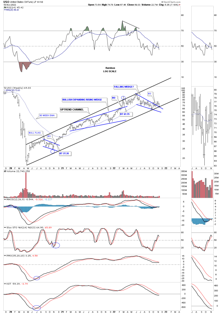 One thing I have been noticing lately when it comes to oil and the oil stocks is that the oil stocks seem a bit stronger than oil itself so I built out a new ratio combo chart which compares some of the different areas to the USO. The first chart is just a weekly chart for the USO which shows its rally out of the 2020 crash low.