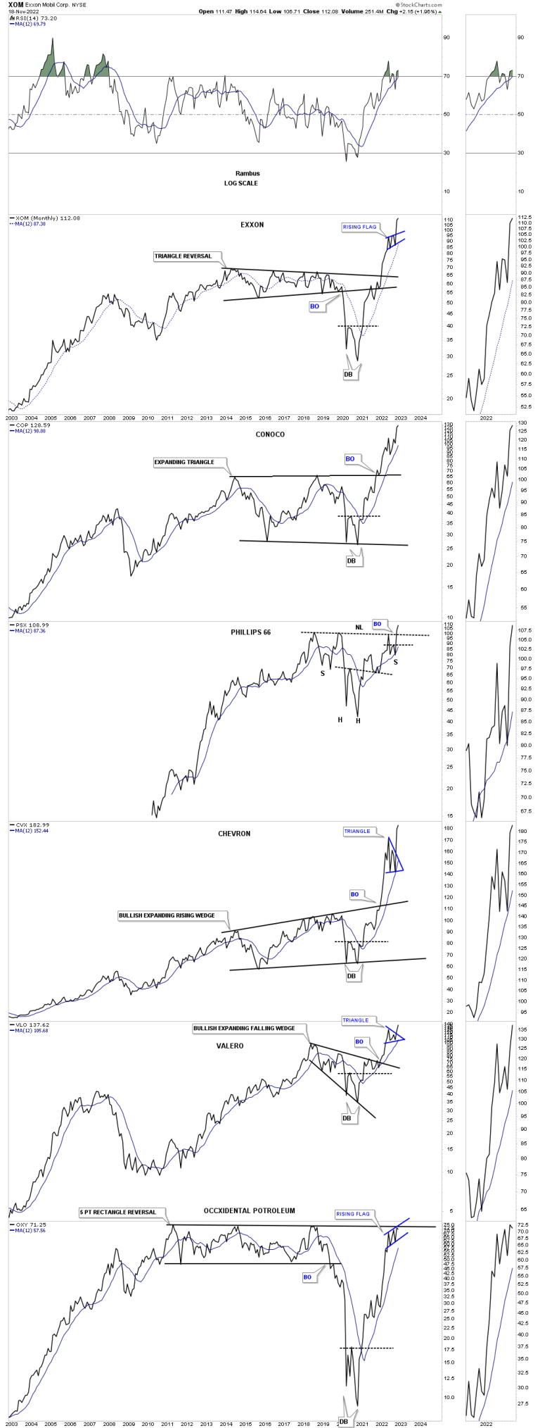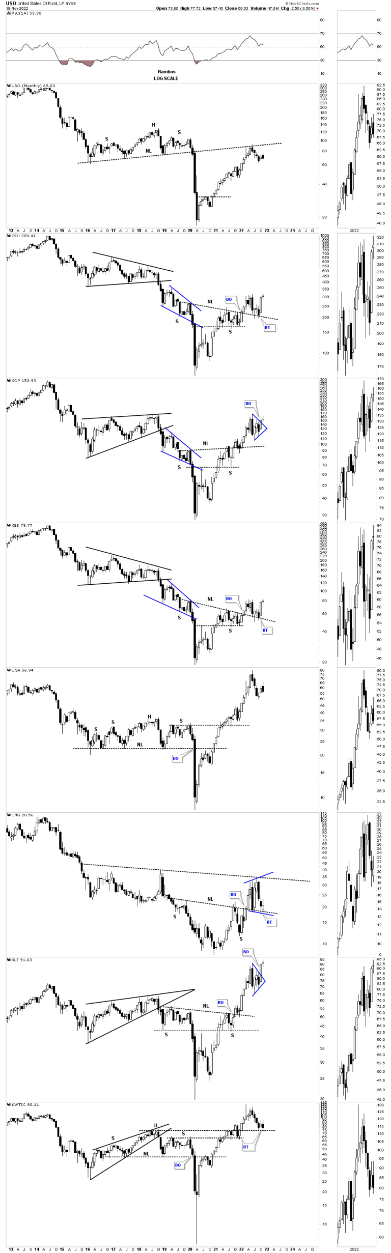 Below is a ten year candlestick chart for the oil complex which shows the large bases with many in backtest to their neckline and a few blue triangle consolidation patterns.