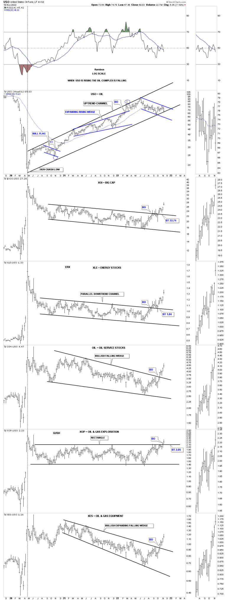 I built a few new combo chart this weekend, related to oil sector, to see if I could paint a more clearer picture of what is taking place. Since the 2020 crash low the USO, US oil fund, has had a very strong rally with the high being made back in the middle of June around 93 or so. The USO has been forming a new trading range since the June high and is currently testing the top rail of the blue falling wedge and the bottom trendline the 2020 uptrend channel. So the moment of truth has arrived.