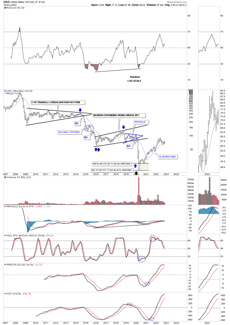 This long term monthly chart for USO shows you what a classic bear market looks like with one consolidation pattern forming below the previous one. The last consolidation pattern that formed was the bearish expanding rising wedge which worked out beautifully as a halfway pattern into the final bear market low as shown by the brown shaded S&R zone. Again, you can see the capitulation move into the final bear market low. Currently the USO is testing its 12 month sma which has done a pretty good job of holding support since the bear market low. It also did a good job of resistance during the impulse move between the two bear market consolidation patterns.