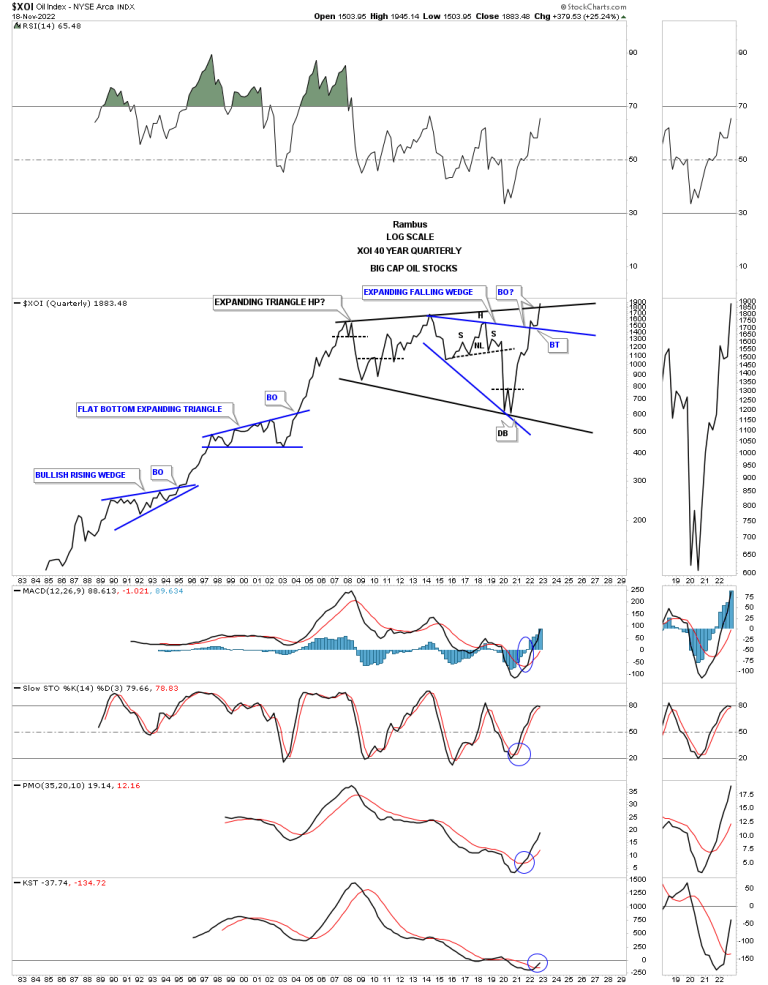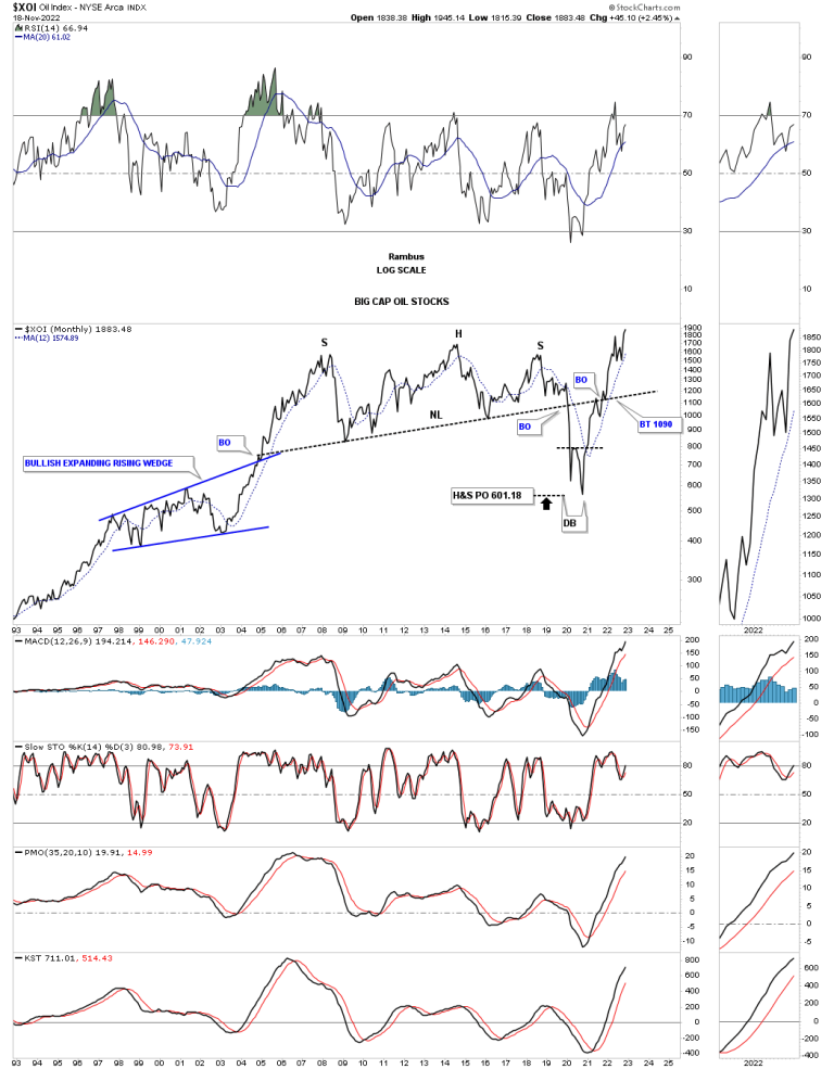 Next I would like to show you a long term monthly chart for the XOI which is made up of big cap Oil stocks. After building out it massive H&S top the breakout move into the 2020 crash low reached it price objective and then put in the double bottom that reversed that vertical move down. Note how the price action interacted with the neckline on the way back up. First, the initial hit and small selloff followed by the breakout and and backtest before moving higher. As you can see the XOI is making a new all time high this month.