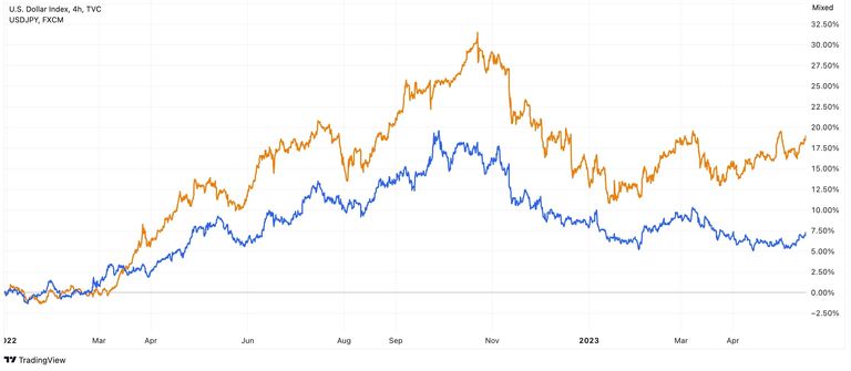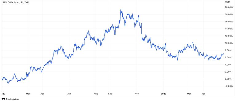 To begin with, let's examine the performance of the US dollar since the start of 2022, a period marked by the military conflict between Russia and Ukraine, as well as energy and financial crises. Due to the Federal Reserve's hawkish policy, the USD exhibited significant strength during this time. However, other major currencies managed to narrow the gap. A glance at the US dollar index chart reveals this trend.