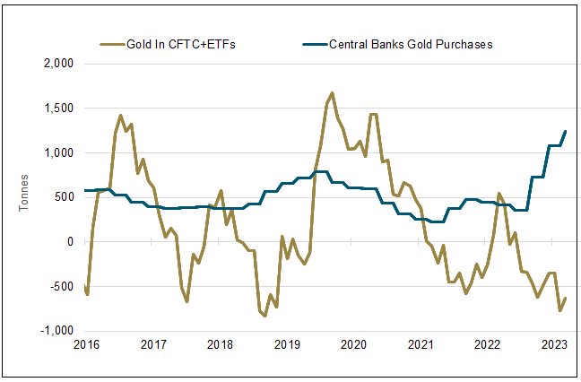 Source: Bloomberg. Rolling 12-month net gold purchases by central banks, and CFTC and ETF gold investment flows, metric tonnes. Data as of 5/31/2023. Included for illustrative purposes only. Past performance is no guarantee of future results.