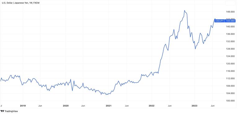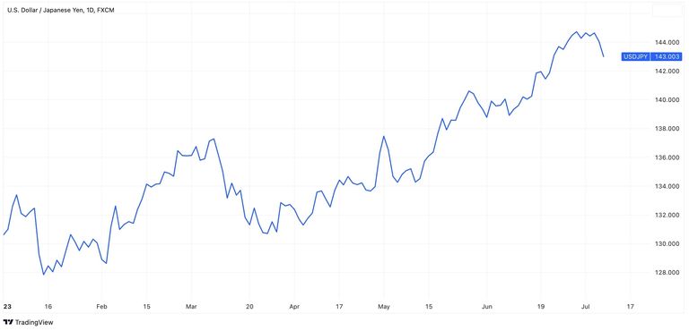 First, let’s take a look at the chart showing the movements of the USD/JPY currency pair this year. The rate has fluctuated from 128 to 143, representing a 10% growth in six months.