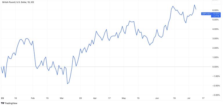 Let’s examine the chart showing the GBP/USD currency pair movements in 2023. It is evident that the pound has exhibited consistent growth since March.