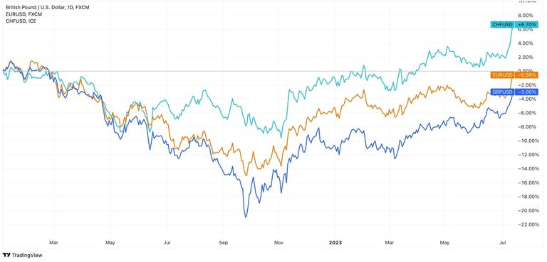 In fact, the frank, the euro, and the pound have bridged the gap.