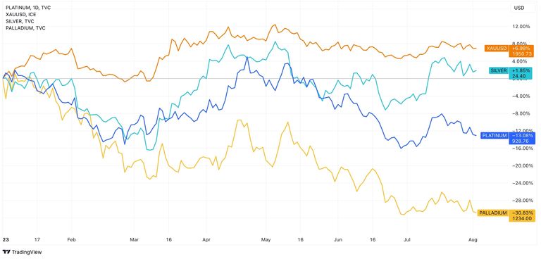 The US dollar isn't the most promising asset for investment in 2023 – and historically, metals have often become alternative options during such times. Gold has shown substantial gains compared to the USD, while silver has also performed well, though to a lesser extent. However, platinum and palladium are far from their metal colleagues' figures. But why and what factors have affected the prices? Let's find the answers.