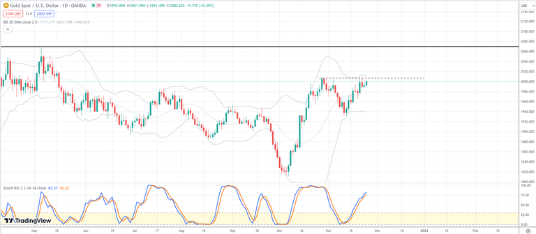 Still, the daily chart shows a confluence of resistance at $2010. I think the worst thing for bulls is that the price continues sideways till around Christmas. At best – a quick run to $2070 comes into view, with a convincing breach of $2010.