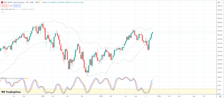 It is absolutely no surprise that stocks are higher yet again this week. Is it time to sell? I suggested that the top Bollinger band on the weekly timeframe could pull price up; we aren’t there yet. That said, the ascent in the S&P has been steep, to say the least, and some sort of sideways move or pullback is imminent. I’m not ready to call the top here, though, and as of now, my base case is that dips are for buying.