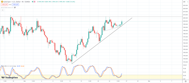 On the 4-hour timeframe, the upward trendline from $1930 is clear. Of course, I will let the trendline be a guide. Bulls look to be supporting a triangle pattern in progress, and momentum is turning up for them as well.