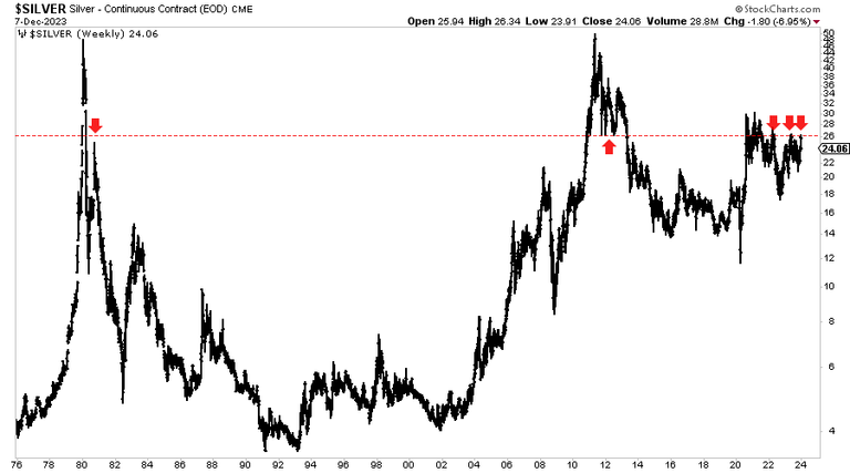 The $26 level is an important historical pivot point (first rally after the 1980 crash, major support after the 2011 peak, and resistance over the past two years) and marks the 50% retracement of the move from the all-time highs to early 1990s lows.