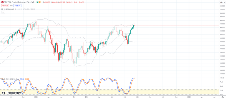 On the weekly timeframe, the top Bollinger band target I have been suggesting as a target has moved up - as a function of the range widening. Below is an update of that chart. Do stocks have higher to go? Possibly - but at this point, the rate of ascent is at serious risk of slowing (at a minimum) in my opinion; there’s never anything wrong with taking at least some money off the table.