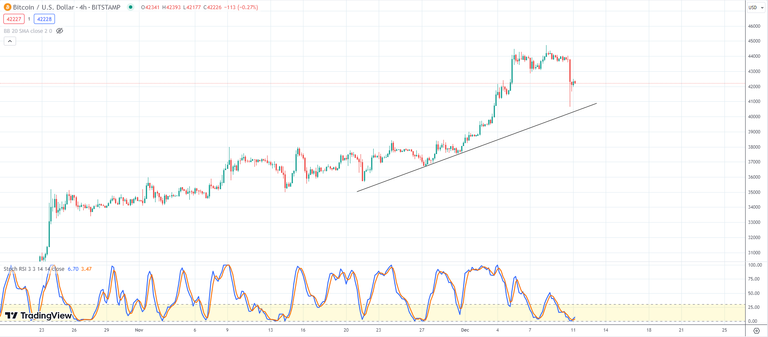 Bitcoin is finally showing signs of (somewhat) slowing down in the 42k range. I have a feeling the time to buy the dip in Bitcoin may coincide with the time to buy the dip in gold. The 4-hour chart below shows a support line that, if breached, would probably lead prices lower, in my opinion.