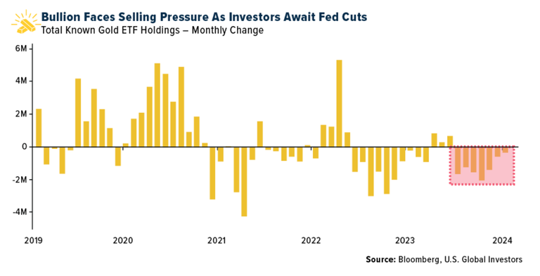 - Investors of bullion-backed exchange-traded funds (ETFs) are on edge, with December marking the seventh straight month of outflows despite gold’s positive performance last year. The trend may not reverse until the market is convinced that the Fed is firmly on a path of looser monetary policy, which tends to help the non-interest-bearing metal, as reported by Bloomberg. Expectations that the central bank was poised to cut interest rates sooner than expected helped propel the precious metal to a record last month. But that euphoria has since tempered with swaps markets now seeing an almost 70% chance of a cut by March — lower than the 85% odds seen in late December.