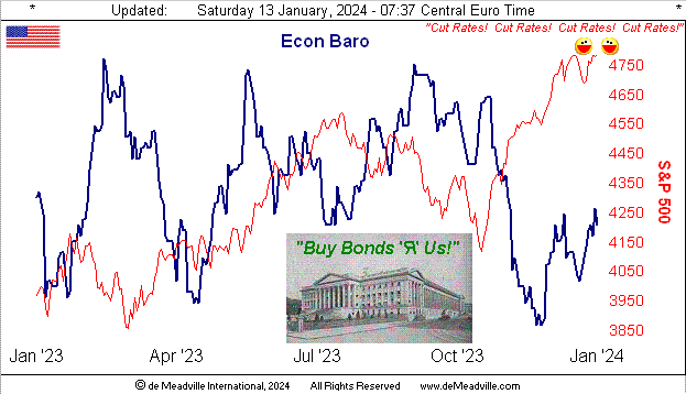 On to the Economic Barometer, which from its 06 December low has been ratcheting up in recovery. Specific to this past week’s array of just nine incoming metrics — December’s zany inflation/deflation notwithstanding — we categorize just one as “worse” period-over-period (and yes ’tis boring): November’s Wholesale Inventories reduced at a slower pace than those for October. Otherwise, everything’s “Great!” (recall the Baro herein a week ago). Why, the Monthly Treasure Deficit for December was better than halved from November … so exciting, non? (Well, maybe not, depending on one’s contextual data source). Here’s the whole year-over-year picture: