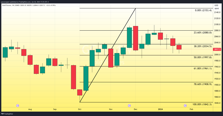 During the first week in January, gold sustained a $22 price decline. During the second week of January gold traded to a lower low and a lower high, however closed almost unchanged, gaining $1.80. Selling pressure returned during the third week of January, resulting in a $22.30 price decline, and finished off the fourth week of January with an additional $12 decline.