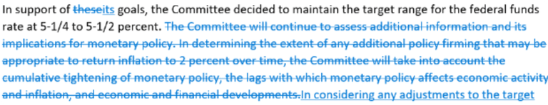 Secondly, the written statement removed comments that address additional policy firming, that is, additional rate hikes. Removed from the statement was the following comment that was contained in prior Fed statements: “the committee will continue to assess additional information and its implications for monetary policy. In determining the extent of any additional policy firming that may be appropriate to return inflation to 2% over time, the committee will take into account the cumulative tightening of monetary policy, the legs with which monetary policy affects economic activity and inflation, and economic and financial developments.”
