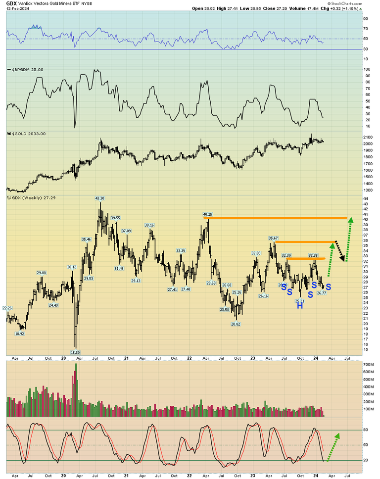 Double-click to enlarge this GDX weekly chart. The 14,5,5 series Stochastics oscillator has reached oversold status with the key BPGDM sentiment indicator sitting below 30. There's positive divergence between both Stochastics and RSI with the price. It's an extremely positive set-up.