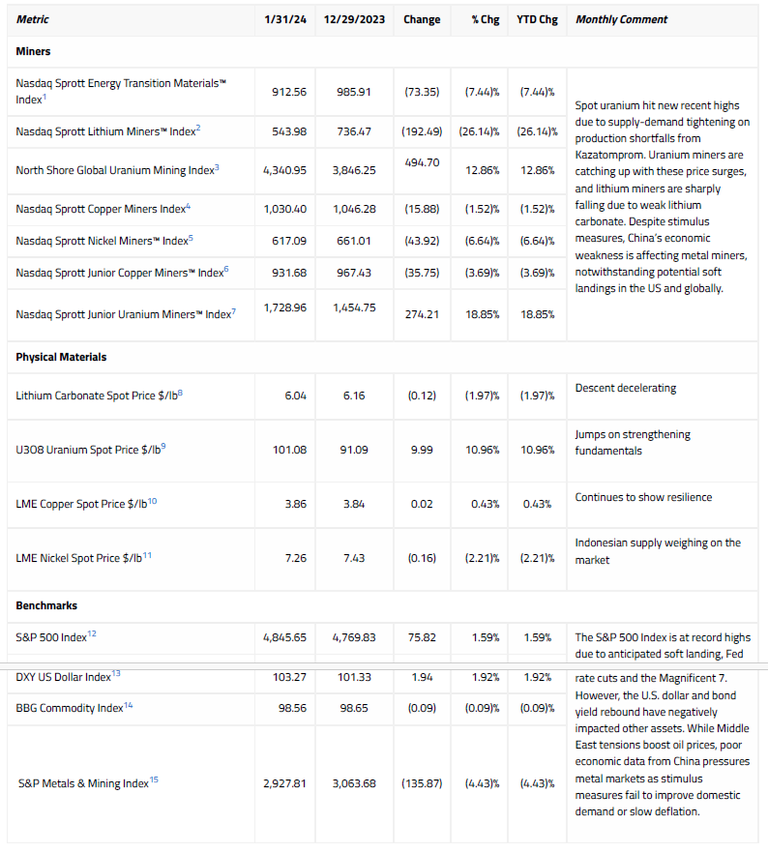 - The Nasdaq Sprott Energy Transition Index declined in January. Spot uranium prices made new cycle highs on supply-demand pressures, while lithium and nickel were somewhat soft.