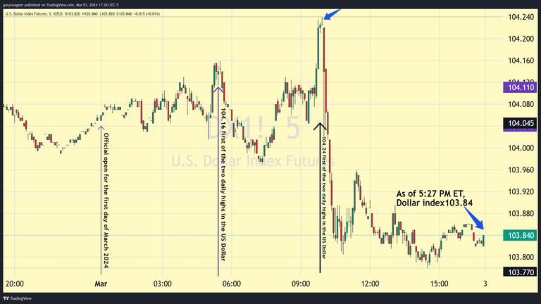 The next chart we want to look at is a five-minute candlestick chart of the dollar index which traded to a high today of 104.324, a low of 103.859, and settled down 0.24% at 103.904. The dollar traded with some volatility today, compared to what was witnessed in gold futures.