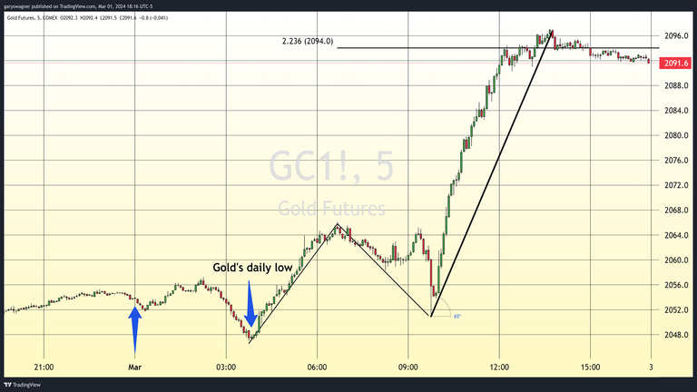 The chart above is a five-minute Japanese candlestick chart of April gold futures. The first blue arrow on the left marks the beginning of the trading day with gold opening at $2052.82. Approximately 3 ½ hours later gold would trade to its low of approximately $2047 and begin the first leg of two rallies that would take gold dramatically higher. Gold would trade from $2047 up to $2066 in just over two hours before trading to another low of $2051, which was above the daily low and was a precursor to the dramatic second leg of the rally which took gold from $2051 to its high above $2096 before trading sideways are consolidating and currently at $2091.60 its settlement price for the week.