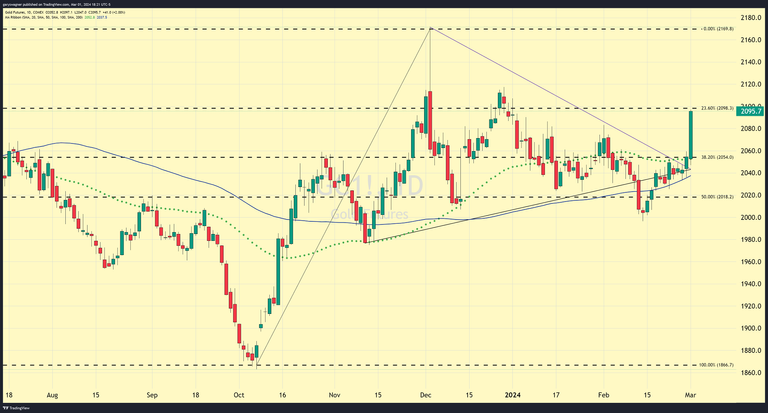 Exceptional, phenomenal, amazing, surprising, astounding, and almost beyond belief are only a few of the many words that can be used to describe today’s exceedingly strong upside breakout in gold futures. Gold opened today at $2052.82 and by the close of Globex at 5:00 PM ET gold futures are up $41. At the close, the most active April gold futures contract is trading at $2095.70, a 2% daily gain.