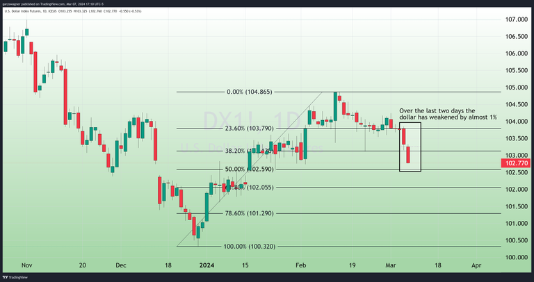 As of 5:00 PM ET, the dollar is in its second day of strong declines. Today the dollar is down 0.53% taking the index to 102.77. When compared to gains in gold futures which gained 0.5% it is easy to derive the fact that today’s gains were 100% the net result of dollar weakness because the dollar declined slightly more than gold gained.