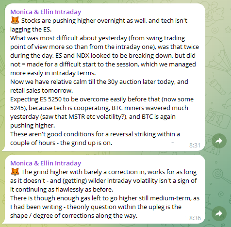 Instead, a flush such as Friday can‘t be ruled out even if the upleg is nowhere near finished, and disinflation losing steam isn‘t an issue for this earnings, fundamentals driven rally within still strongly growing economy and rich corporate and household balance sheets (see specialty retailers, or discretionaries in general) – what‘s thus tougher to capture in swing terms if you first aim for two or three dozen ES points flush, is easier to navigate in intraday terms regardless of yesterday‘s volatility, which was precisely the case.