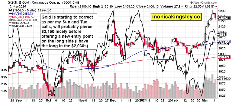 The announced corrective consolidation in gold has started, and I see it breaking $2,150, so let‘s wait and gauge sensitivity to rising yields before rushing in long again.